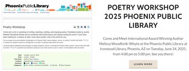Come and Meet International Award Winning Author Melissa Woodforlk-Whyte at the Phoenix Public Library, Ironwood Library, Phoenix, AZ, Friday, February 6, 2026, 3:30 pm to 4:30 pm. See you there!